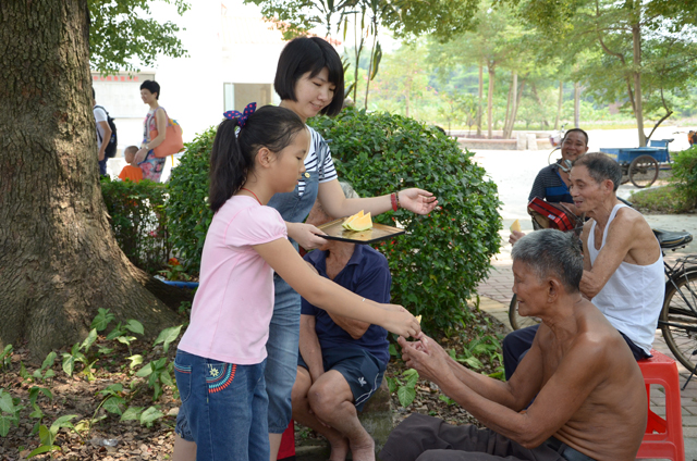 中秋佳节临近,听岛上的志愿者说老人们今年还没尝到月饼呢,盟大集团的鸟人团队迅速行动起来。19日,10多位鸟人代表带着月饼水果来到岛上,为老人们提前过中秋。